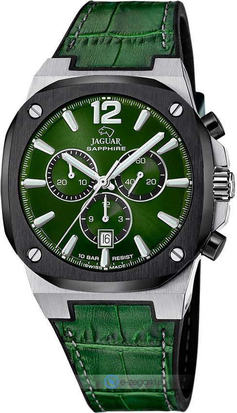 Zegarek męski J1026-3 marki Jaguar to dobra propozycja dla osób ceniących sobie dbałość o szczegóły oraz sprawne funkcjonowanie mechanizmów. Ciekawy wygląd czasomierza uzyskano m.in. poprzez cyferblat w kolorze zielonym. Zegarek ten prezentuje godzinę w formacie analogowym dzięki czemu odczyt jest bardzo łatwy. Koperta w odcieniach koloru stalowego szeroka jest na 42 mm - ma okrągły kształt.