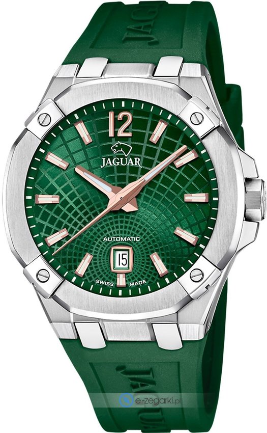 Zegarek męski J1030-3 marki Jaguar to dobre połączenie funkcjonalności i modnego wzornictwa. Charakterystyczny wygląd zegarka osiągnięto m.in. poprzez cyferblat w kolorze zielonym. Zegarek ten pokazuje aktualny czas w formacie analogowym dzięki czemu odczyt jest bezproblemowy. Koperta szeroka jest na 44 mm - ma okrągły kształt.