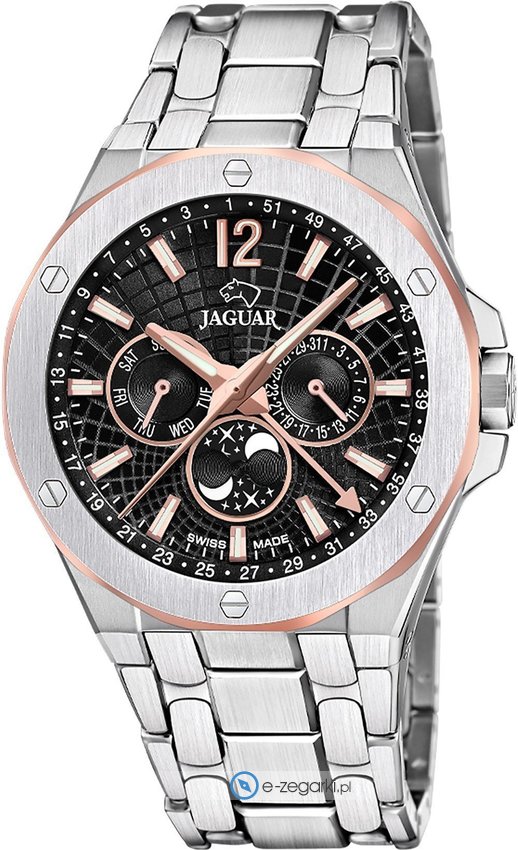 Zegarek męski J1039-4 marki Jaguar to idealne połączenie funkcjonalności a także modnego wzornictwa. Nieschematyczny wygląd zegarka osiągnięto również dzięki tarczy w kolorze czarnym. Pokazana metodą analogową bieżąca godzina jest czytelna i łatwa do sprawdzenia. Koperta szeroka jest na 44 mm - wyróżnia się okrągłym kształtem.