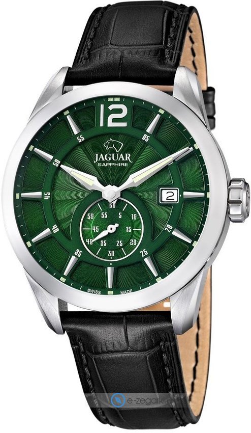 Zegarek męski J663-3 marki Jaguar to dobre połączenie funkcjonalności oraz ciekawego wzornictwa. Wysokiej jakości cyferblat zegarka pokryto zielonym kolorem. Zaprezentowana metodą analogową aktualna godzina jest czytelna i prosta do odczytania. Koperta szeroka jest na 43 mm - w kształcie okrągłym.