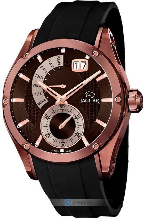 Zegarek męski J680-1 marki Jaguar to ciekawa pozycja dla osób ceniących sobie dbałość o szczegóły oraz sprawne zachowanie mechanizmów. Ciekawy wygląd czasomierza osiągnięto m.in. poprzez tarczę w kolorze brązowym. Pokazana metodą analogową aktualna godzina jest czytelna i prosta do odczytania. Koperta szeroka jest na 44 mm - w kształcie okrągłym.