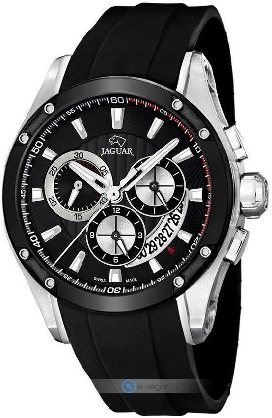 Zegarek męski J688-1 marki Jaguar to stylowe połączenie funkcjonalności oraz ciekawego wzornictwa. Niebanalny wygląd czasomierza uzyskano m.in. poprzez cyferblat w kolorze czarnym. Godzina zaprezentowana jest w sposób analogowy co niezmiernie łatwo pozwala ją odczytać. Koperta szeroka jest na 45 mm - ma okrągły kształt.