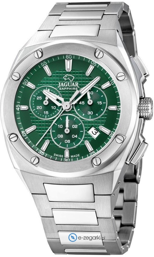Model J805-C marki Jaguar to elegancki zegarek naręczny męski, który wyposażono w pomysłowe rozwiązania i funkcje. Charakteru dodaje wysokiej jakości tarcza w kolorze zielonym. Zaprezentowana metodą analogową aktualna godzina jest czytelna i prosta do sprawdzenia. Koperta jest ozdobiona kolorem srebrnym szeroka jest na 44 mm - w kształcie okrągłym.