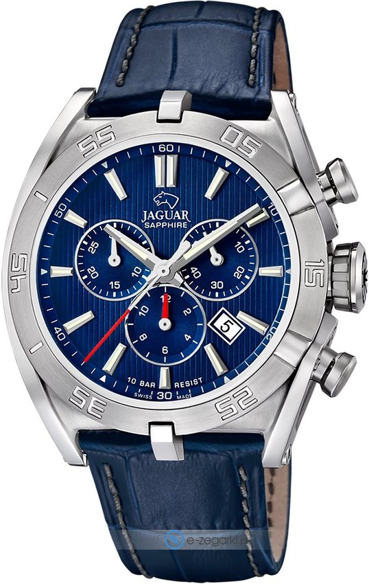 Model J857-B marki Jaguar to elegancki zegarek naręczny męski, który jest wyposażony w ciekawe rozwiązania i funkcje. Atrakcyjny wygląd zegarka osiągnięto m.in. poprzez cyferblat w kolorze niebieskim. Zegarek ten pokazuje godzinę w formacie analogowym dzięki czemu odczyt jest intuicyjny. Koperta szeroka jest na 45 mm - w kształcie okrągłym.