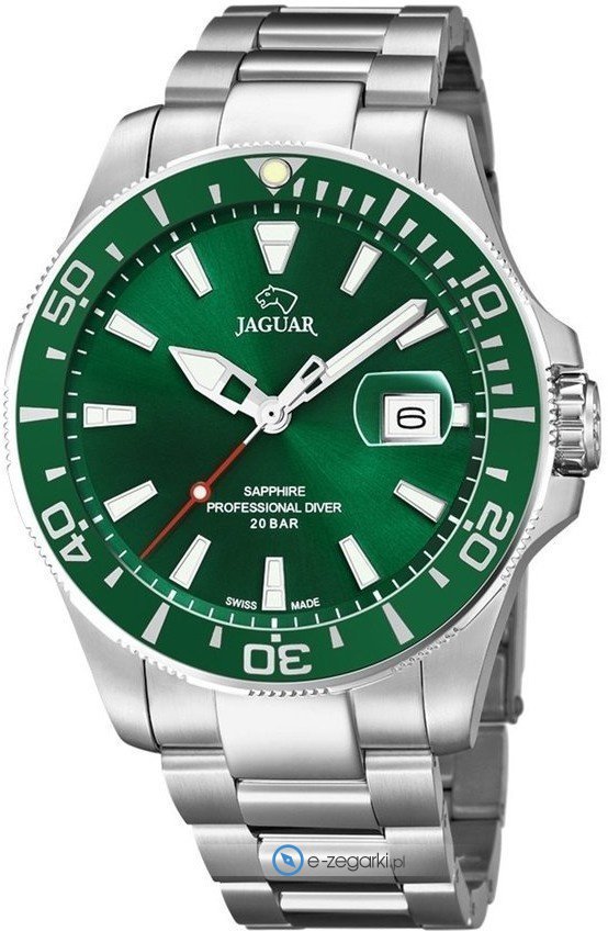 Zegarek męski J860-B marki Jaguar to dobre połączenie funkcjonalności oraz modnego designu. Nieschematyczny wygląd czasomierza uzyskano poprzez cyferblat w kolorze zielonym. Koperta szeroka jest na 43 mm - w kształcie okrągłym.