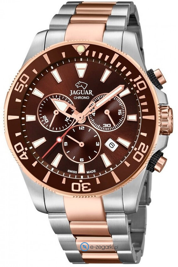 Model J868-1 marki Jaguar to stylowy zegarek naręczny męski, który wyposażono w ciekawe rozwiązania oraz funkcje. Charakteru nadaje wysokiej klasy cyferblat w kolorze brązowym. Godzina prezentowana jest w sposób analogowy co niezmiernie łatwo pozwala ją odczytać. Koperta szeroka jest na 44 mm oraz ma grubość 18 mm - posiada okrągły kształt.