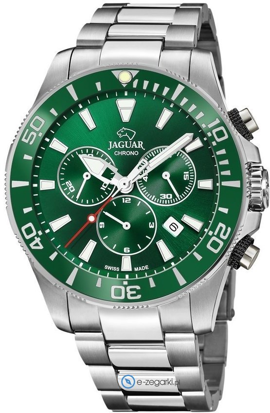 Model J872-2 marki Jaguar to elegancki zegarek naręczny męski, który posiada ciekawe rozwiązania i funkcje. Stylu dodaje wysokiej jakości cyferblat w kolorze zielonym. Zaprezentowana metodą analogową aktualna godzina jest czytelna i prosta do odczytania. Koperta w odcieniach koloru srebrnego szeroka jest na 46 mm - charakteryzuje się okrągłym kształtem.