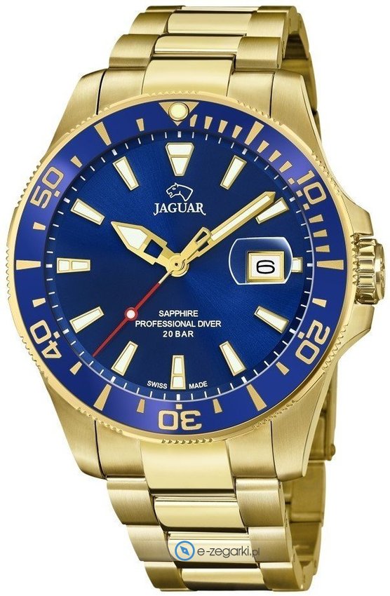 Model J877-1 marki Jaguar to gustowny zegarek naręczny męski, który wyposażono w pomysłowe rozwiązania oraz funkcje. Charakterystyczny wygląd czasomierza osiągnięto również dzięki tarczy w kolorze niebieskim. Zegarek ten pokazuje aktualny czas w formacie analogowym dzięki czemu odczyt jest bezproblemowy. Koperta w barwach koloru złotego szeroka jest na 43 mm oraz ma grubość 12 mm - charakteryzuje się okrągłym kształtem.