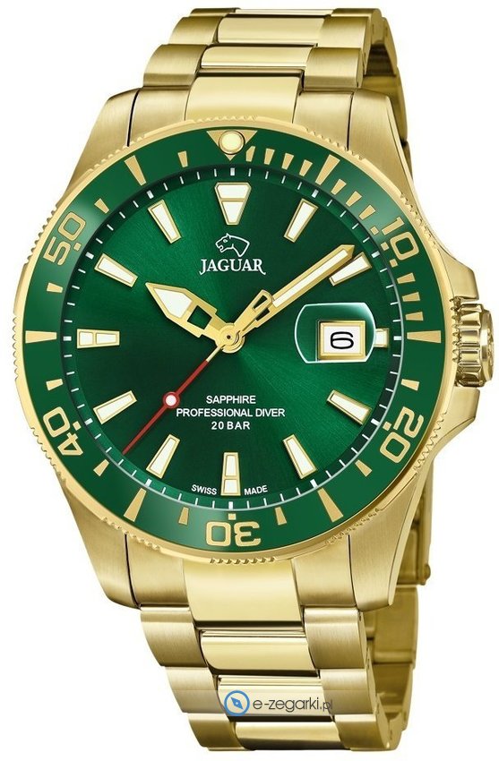 Męski zegarek Jaguar J877-2 to zegarek, który dzięki swemu wzornictwu zawsze będzie prezentował się dobrze. Nieschematyczny wygląd zegarka osiągnięto m.in. poprzez tarczę w kolorze zielonym. Godzina pokazywana jest w sposób analogowy co intuicyjnie pozwala ją odczytać. Koperta została ozdobiona kolorem złotym szeroka jest na 44 mm - w kształcie okrągłym.
