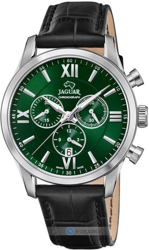 Męski zegarek Jaguar J884-3 to zegarek, który dzięki swemu wzornictwu zawsze będzie prezentował się dobrze. Charakteru nadaje wysokiej jakości tarcza w kolorze zielonym. Aktualna godzina prezentowana jest w sposób analogowy co niezmiernie łatwo pozwala ją odczytać. Koperta jest ozdobiona kolorem srebrnym szeroka jest na 41 mm - posiada okrągły kształt.