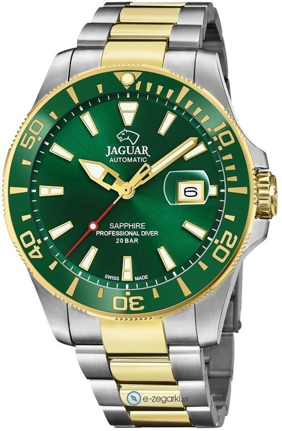 Zegarek męski J887-2 marki Jaguar to ciekawa propozycja dla osób ceniących sobie dbałość o detale oraz bezawaryjne funkcjonowanie mechanizmów. Stylu dodaje wysokiej klasy cyferblat w kolorze zielonym. Godzina prezentowana jest w sposób analogowy co niezmiernie łatwo pozwala ją odczytać. Koperta jest w kolorze srebrno złotym szeroka jest na 44 mm - posiada okrągły kształt.