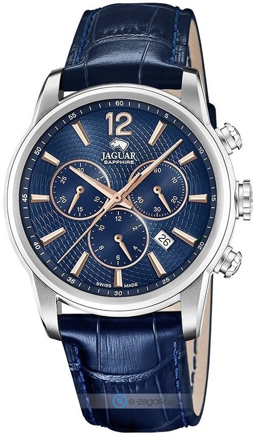 Zegarek męski J968-2 marki Jaguar to dobre połączenie funkcjonalności oraz ciekawego wzornictwa. Charakterystyczny wygląd zegarka uzyskano m.in. poprzez tarczę w kolorze niebieskim. Zaprezentowana metodą analogową bieżąca godzina jest czytelna i łatwa do odczytania. Koperta w barwach koloru srebrnego szeroka jest na 42 mm oraz ma grubość 12 mm - w kształcie okrągłym.