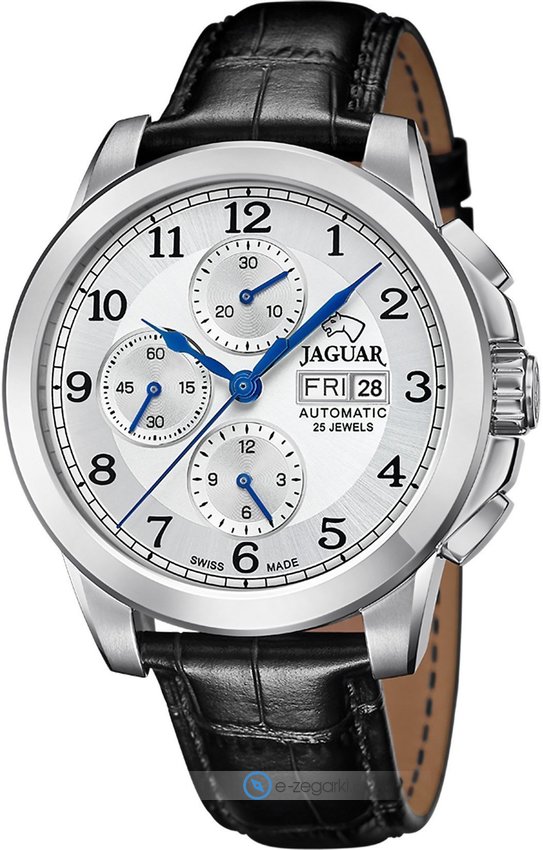 Model J975-1 marki Jaguar to stylowy zegarek naręczny męski, który wyposażono w pomysłowe rozwiązania i funkcje. Charakter zapewnia wysokiej klasy tarcza w kolorze srebrnym. Zegarek ten pokazuje godzinę w formacie analogowym dzięki temu odczyt jest bardzo łatwy. Koperta szeroka jest na 45 mm - posiada okrągły kształt.