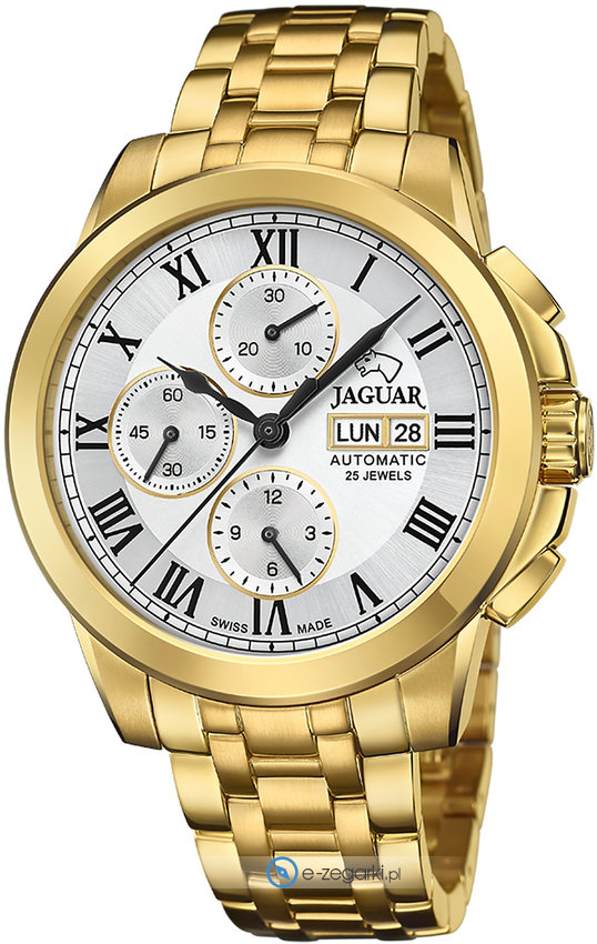 Zegarek męski J979-1 marki Jaguar to stylowe połączenie funkcjonalności oraz modnego wzornictwa. Tarcza zegarka jest w kolorze srebrnym. Zaprezentowana metodą analogową aktualna godzina jest czytelna i szybka do sprawdzenia. Koperta jest w kolorze złotym szeroka jest na 45 mm oraz ma grubość 16 mm - charakteryzuje się okrągłym kształtem.