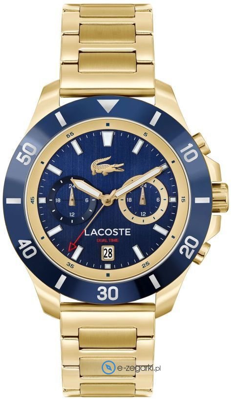Zegarek męski 2011343 marki Lacoste to idealna propozycja dla osób ceniących sobie dbałość o szczegóły jak również bezproblemowe działanie mechanizmów. Charakterystyczną konstrukcję zegarka osiągnięto dzięki tarczy w kolorze niebieskim. Zegarek ten pokazuje godzinę w formacie analogowym dzięki temu odczyt jest intuicyjny. Koperta jest ozdobiona kolorem złotym szeroka jest na 44 mm - ma okrągły kształt.