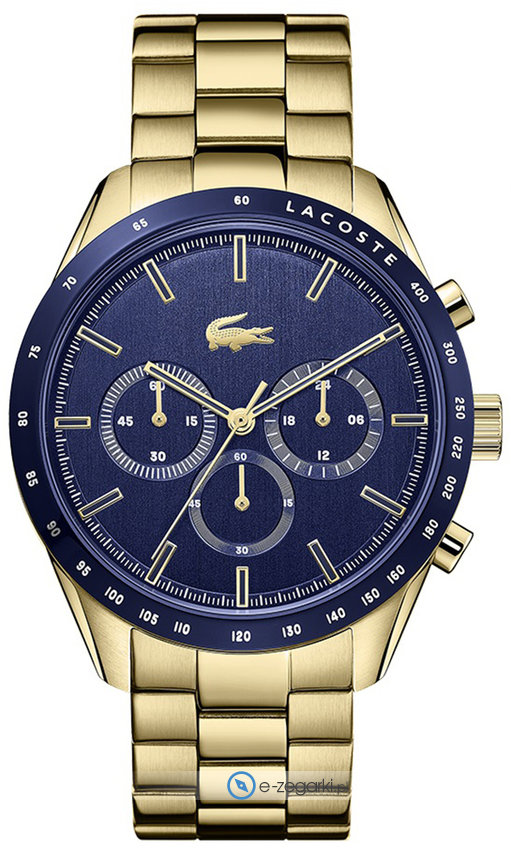 Model BOSTON-2011096 marki Lacoste to gustowny zegarek naręczny męski, który wyposażono w ciekawe rozwiązania i funkcje. Ciekawy wygląd czasomierza osiągnięto m.in. poprzez tarczę w kolorze granatowym. Zegarek ten pokazuje aktualny czas w formacie analogowym dzięki temu odczyt jest bezproblemowy. Koperta jest w kolorze złotym szeroka jest na 42 mm - cechuje się okrągłym kształtem.