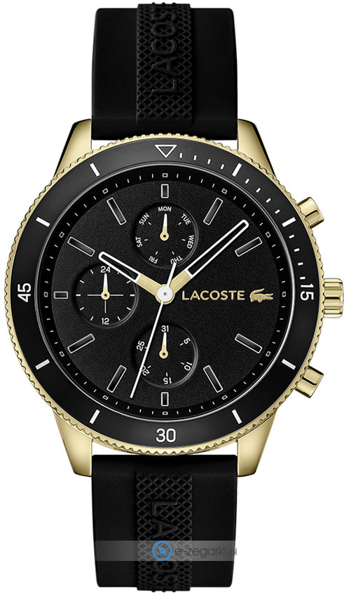 Zegarek męski KEY-WEST-2010994 marki Lacoste to stylowe połączenie funkcjonalności oraz ciekawego wzornictwa. Cyferblat zegarka w kolorze czarnym. Zegarek ten pokazuje godzinę w formacie analogowym dzięki temu odczyt jest bardzo łatwy. Koperta została ozdobiona kolorem złotym szeroka jest na 44 mm oraz ma grubość 10 mm - w kształcie okrągłym.