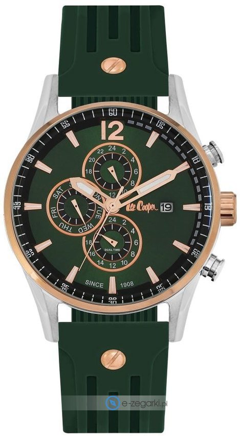 Model LC06419.375 marki Lee Cooper to stylowy zegarek naręczny męski, który wyposażono w ciekawe rozwiązania i funkcje. Niestereotypowy wygląd czasomierza uzyskano dzięki tarczy w kolorze zielonym. Koperta szeroka jest na 44 mm - ma okrągły kształt.