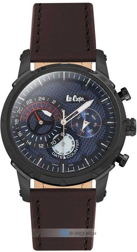 Zegarek męski LC06520.692 marki Lee Cooper to ciekawa propozycja dla osób ceniących sobie dbałość o szczegóły jak również bezawaryjne zachowanie mechanizmów. Styl zapewnia wysokiej jakości tarcza w kolorze granatowym. Koperta jest w kolorze czarnym szeroka jest na 47 mm - ma okrągły kształt.