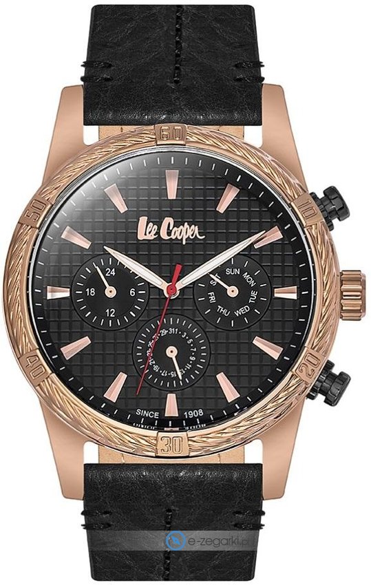 Zegarek męski LC06524.451 marki Lee Cooper to dobra propozycja dla ludzi ceniących sobie dbałość o szczegóły jak również bezawaryjne działanie mechanizmów. Wysokiej trwałości cyferblat zegarka pokryto czarnym kolorem. Koperta szeroka jest na 46 mm - cechuje się okrągłym kształtem.