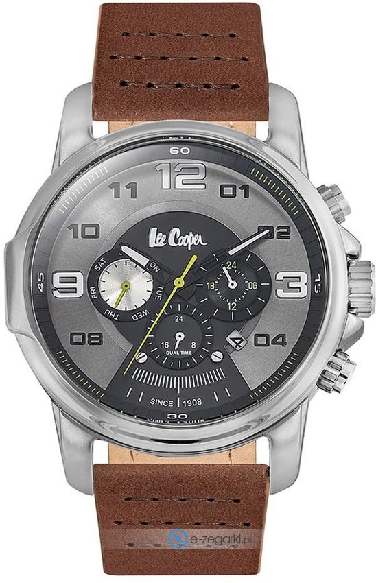 Model LC06525.362 marki Lee Cooper to stylowy zegarek naręczny męski, który wyposażono w ciekawe rozwiązania oraz funkcje. Wysokiej jakości cyferblat zegarka pokryto brązowym kolorem. Koperta w barwach koloru stalowego szeroka jest na 47 mm - posiada okrągły kształt.