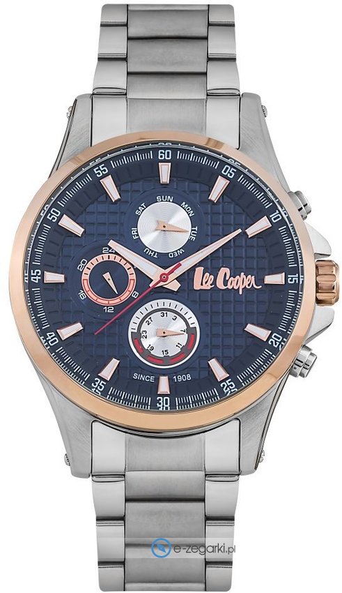 Zegarek męski LC06661.590 marki Lee Cooper to stylowe połączenie funkcjonalności oraz ciekawego designu. Wysokiej trwałości cyferblat zegarka pokryto granatowym kolorem. Koperta szeroka jest na 46 mm - charakteryzuje się okrągłym kształtem.