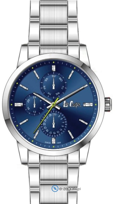 Model LC06674.390 marki Lee Cooper to elegancki zegarek naręczny męski, który jest wyposażony w ciekawe rozwiązania i funkcje. Styl zapewnia wysokiej klasy tarcza w kolorze granatowym. Koperta została pokryta kolorem stalowym szeroka jest na 44 mm - charakteryzuje się okrągłym kształtem.