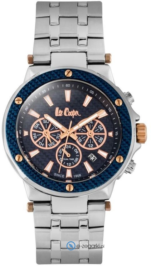 Zegarek męski LC06746.390 marki Lee Cooper to stylowe połączenie funkcjonalności i modnego wzornictwa. Wysokiej trwałości cyferblat zegarka ozdobiono granatowym kolorem. Koperta jest w kolorze stalowym szeroka jest na 44 mm - ma okrągły kształt.