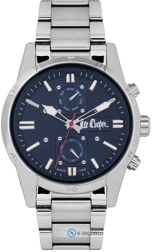 Męski zegarek Lee Cooper LC06760.390 to zegarek, który dzięki swemu wzornictwu zawsze będzie prezentował się dobrze. Atrakcyjną stylistykę czasomierza uzyskano dzięki tarczy w kolorze granatowym. Zegarek ten pokazuje aktualny czas w formacie analogowym dzięki temu odczyt jest bardzo łatwy. Koperta jest w kolorze srebrnym szeroka jest na 44 mm - wyróżnia się okrągłym kształtem.
