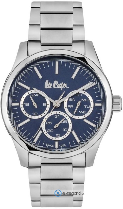 Model LC06764.390 marki Lee Cooper to gustowny zegarek naręczny męski, który wyposażono w ciekawe rozwiązania oraz funkcje. Stylu nadaje wysokiej jakości cyferblat w kolorze granatowym. Koperta w odcieniach koloru stalowego szeroka jest na 43 mm - w kształcie okrągłym.