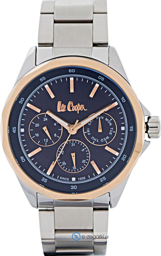 Model LC06766.590 marki Lee Cooper to gustowny zegarek naręczny męski, który posiada pomysłowe rozwiązania i funkcje. Atrakcyjną konstrukcję zegarka uzyskano dzięki tarczy w kolorze granatowym. Zegarek ten prezentuje godzinę w formacie analogowym dzięki temu odczyt jest intuicyjny. Koperta szeroka jest na 44 mm - cechuje się okrągłym kształtem.