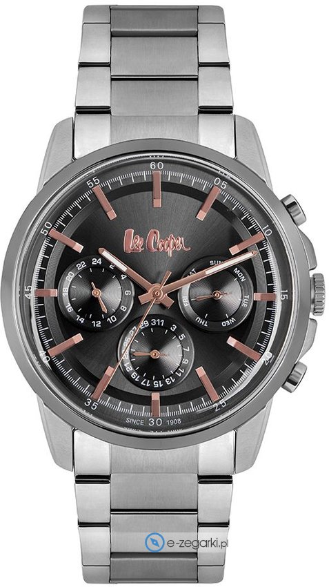 Zegarek męski LC06847.360 marki Lee Cooper to stylowe połączenie funkcjonalności oraz ciekawego wzornictwa. Wysokiej trwałości tarczę zegarka pokryto szarym kolorem. Zegarek ten prezentuje godzinę w formacie analogowym dzięki temu odczyt jest bardzo łatwy. Koperta jest pokryta kolorem stalowym szeroka jest na 43 mm - posiada okrągły kształt.