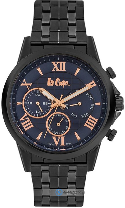 Męski zegarek Lee Cooper LC06849.090 to zegarek, który dzięki swemu wzornictwu zawsze będzie prezentował się dobrze. Atrakcyjny wygląd czasomierza osiągnięto m.in. poprzez tarczę w kolorze granatowym. Pokazana metodą analogową bieżąca godzina jest czytelna i łatwa do sprawdzenia. Koperta jest pokryta kolorem czarnym szeroka jest na 45 mm - charakteryzuje się okrągłym kształtem.