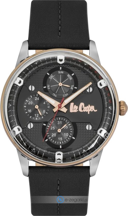 Zegarek męski LC06855.461 marki Lee Cooper to dobre połączenie funkcjonalności i ciekawego designu. Wysokiej trwałości tarczę zegarka ozdobiono czarnym kolorem. Koperta szeroka jest na 45 mm - posiada okrągły kształt.