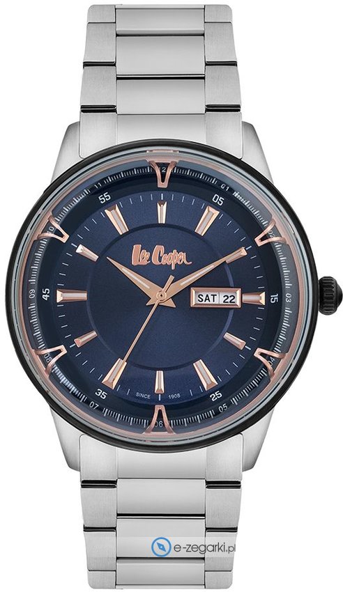 Model LC06856.390 marki Lee Cooper to elegancki zegarek naręczny męski, który posiada ciekawe rozwiązania oraz funkcje. Niestereotypowy wygląd czasomierza osiągnięto także dzięki tarczy w kolorze granatowym. Godzina zaprezentowana jest w sposób analogowy co bez trudu pozwala ją odczytać. Koperta jest w kolorze srebrnym szeroka jest na 43 mm - w kształcie okrągłym.