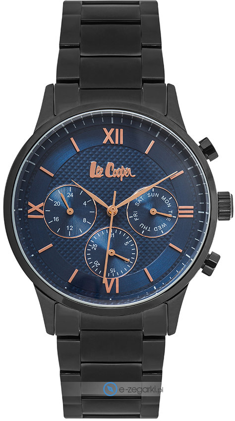 Męski zegarek Lee Cooper LC06922.690 to zegarek, który dzięki swemu wzornictwu zawsze będzie prezentował się dobrze. Atrakcyjny wygląd zegarka uzyskano m.in. poprzez cyferblat w kolorze granatowym. Godzina zaprezentowana jest w sposób analogowy co niezmiernie łatwo pozwala ją odczytać. Koperta w barwach koloru czarnego szeroka jest na 41 mm - cechuje się okrągłym kształtem.
