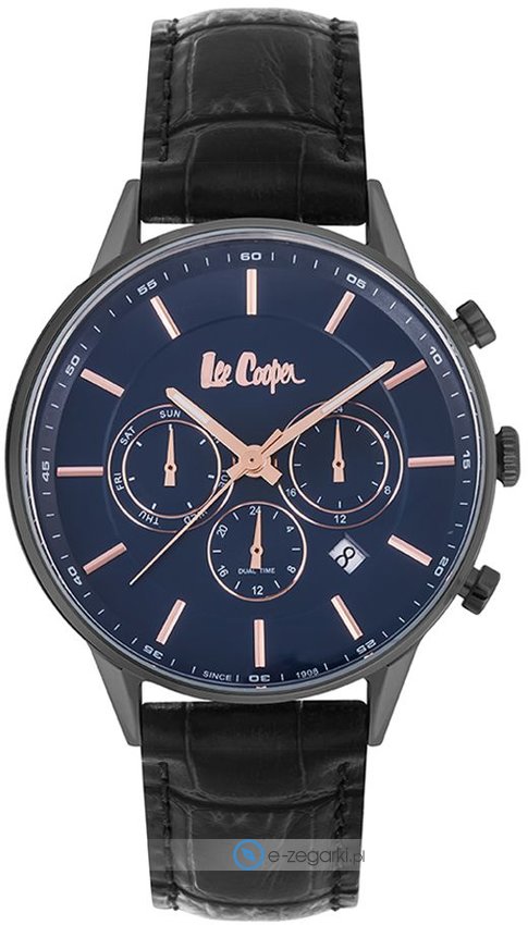 Zegarek męski LC06924.699 marki Lee Cooper to idealne połączenie funkcjonalności i modnego designu. Charakter zapewnia wysokiej jakości cyferblat w kolorze granatowym. Godzina prezentowana jest w sposób analogowy co intuicyjnie pozwala ją odczytać. Koperta jest w kolorze czarnym szeroka jest na 43 mm - w kształcie okrągłym.