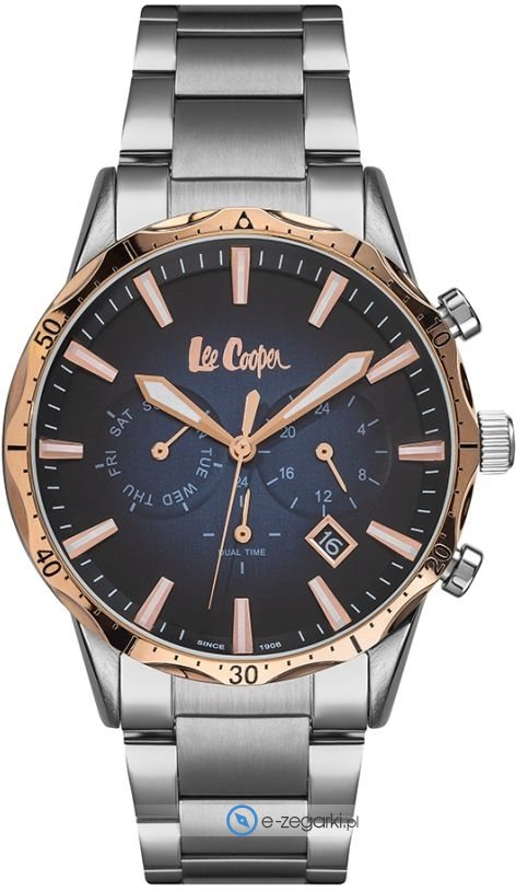 Model LC06952.590 marki Lee Cooper to stylowy zegarek naręczny męski, który jest wyposażony w ciekawe rozwiązania i funkcje. Niebanalną konstrukcję zegarka uzyskano z pomocą tarczy w kolorze granatowym. Zegarek ten pokazuje godzinę w formacie analogowym dzięki temu odczyt jest bezproblemowy. Koperta jest w kolorze stalowym szeroka jest na 44 mm - ma okrągły kształt.