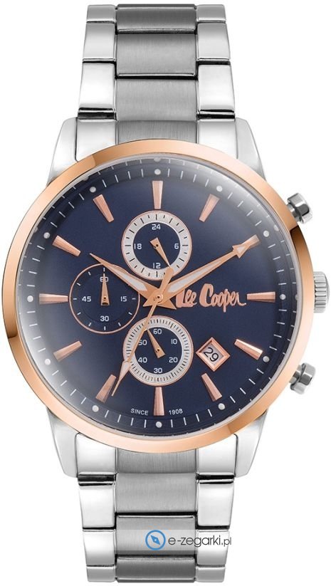 Model LC06961.590 marki Lee Cooper to gustowny zegarek naręczny męski, który posiada pomysłowe rozwiązania oraz funkcje. Atrakcyjny wygląd czasomierza uzyskano także dzięki tarczy w kolorze granatowym. Zegarek ten pokazuje aktualny czas w formacie analogowym dzięki temu odczyt jest bardzo łatwy. Koperta w odcieniach koloru stalowego szeroka jest na 45 mm - ma okrągły kształt.