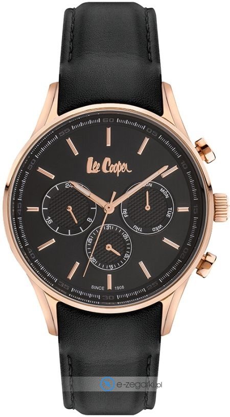 Model LC06971.451 marki Lee Cooper to gustowny zegarek naręczny męski, który posiada ciekawe rozwiązania i funkcje. Wysokiej jakości tarczę zegarka pokryto czarnym kolorem. Zegarek ten prezentuje aktualny czas w formacie analogowym dzięki temu odczyt jest bardzo łatwy. Koperta szeroka jest na 44 mm - charakteryzuje się okrągłym kształtem.
