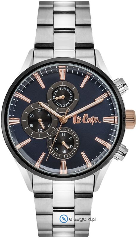 Męski zegarek Lee Cooper LC06978.390 to zegarek, który dzięki swemu wzornictwu zawsze będzie prezentował się dobrze. Niestereotypowy wygląd zegarka osiągnięto m.in. poprzez cyferblat w kolorze granatowym. Aktualna godzina zaprezentowana jest w sposób analogowy co bez trudu pozwala ją odczytać. Koperta w odcieniach koloru stalowego szeroka jest na 45 mm - w kształcie okrągłym.
