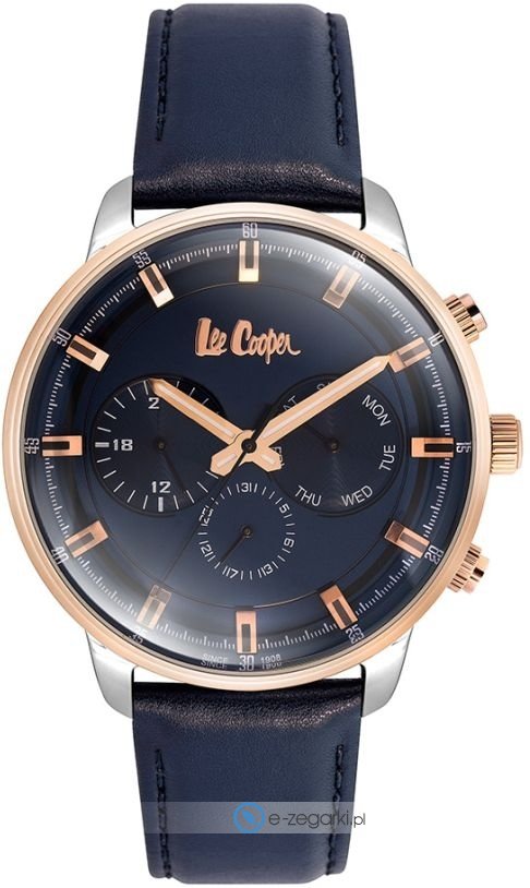 Model LC06984.591 marki Lee Cooper to gustowny zegarek naręczny męski, który posiada ciekawe rozwiązania oraz funkcje. Charakterystyczną konstrukcję czasomierza osiągnięto dzięki tarczy w kolorze granatowym. Zegarek ten pokazuje godzinę w formacie analogowym dzięki czemu odczyt jest bezproblemowy. Koperta jest w kolorze stalowym szeroka jest na 47 mm - posiada okrągły kształt.