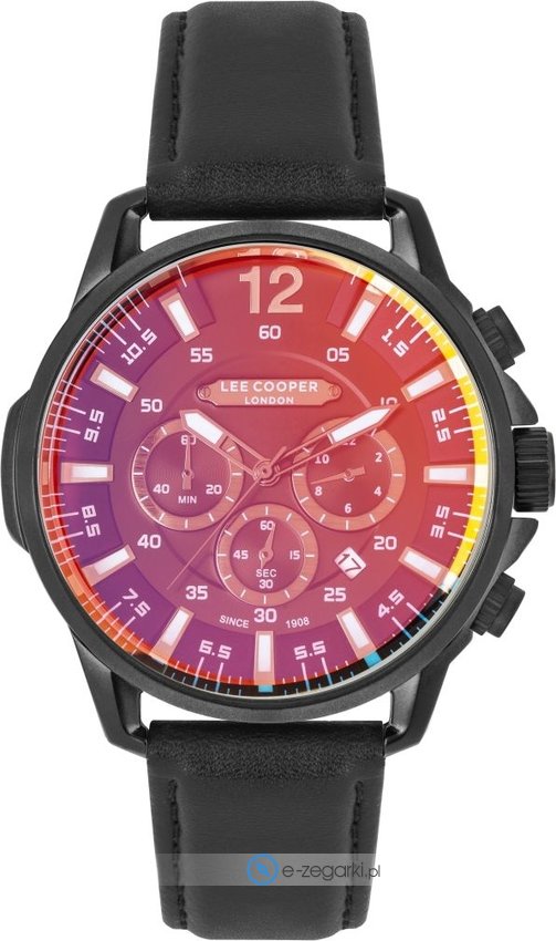 Model LC07062.651 marki Lee Cooper to elegancki zegarek naręczny męski, który wyposażono w ciekawe rozwiązania i funkcje. Ciekawą konstrukcję czasomierza uzyskano dzięki tarczy w kolorze czarnym. Aktualna godzina zaprezentowana jest w sposób analogowy co bez trudu pozwala ją odczytać. Koperta w barwach koloru czarnego szeroka jest na 47 mm - wyróżnia się okrągłym kształtem.