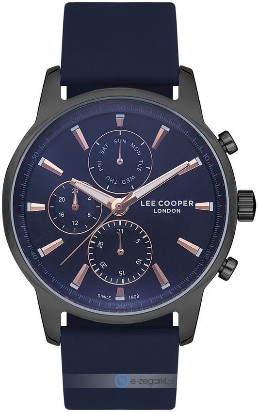 Zegarek męski LC07161.099 marki Lee Cooper to ciekawa propozycja dla osób ceniących sobie dbałość o detale a także sprawne zachowanie mechanizmów. Stylu nadaje wysokiej klasy tarcza w kolorze granatowym. Zaprezentowana metodą analogową aktualna godzina jest czytelna i łatwa do odczytania. Koperta w odcieniach koloru stalowego szeroka jest na 44 mm - w kształcie okrągłym.