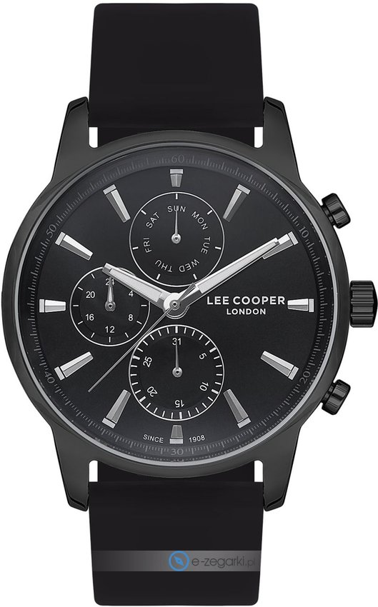 Model LC07161.651 marki Lee Cooper to gustowny zegarek naręczny męski, który posiada pomysłowe rozwiązania i funkcje. Wysokiej jakości tarczę zegarka pokryto czarnym kolorem. Godzina zaprezentowana jest w sposób analogowy co niezmiernie łatwo pozwala ją odczytać. Koperta jest w kolorze czarnym szeroka jest na 44 mm - ma okrągły kształt.