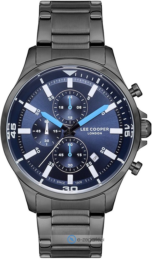 Model LC07179.090 marki Lee Cooper to gustowny zegarek naręczny męski, który posiada ciekawe rozwiązania oraz funkcje. Atrakcyjną budowę czasomierza osiągnięto dzięki tarczy w kolorze granatowym. Zaprezentowana metodą analogową aktualna godzina jest czytelna i prosta do sprawdzenia. Koperta została ozdobiona kolorem stalowym szeroka jest na 45 mm - w kształcie okrągłym.