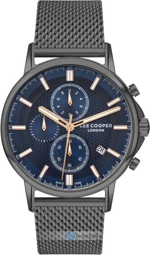 Model LC07272.090 marki Lee Cooper to gustowny zegarek naręczny męski, który wyposażono w ciekawe rozwiązania i funkcje. Charakterystyczny wygląd zegarka osiągnięto m.in. poprzez tarczę w kolorze granatowym. Godzina zaprezentowana jest w sposób analogowy co intuicyjnie pozwala ją odczytać. Koperta jest w kolorze czarnym szeroka jest na 44 mm - cechuje się okrągłym kształtem.