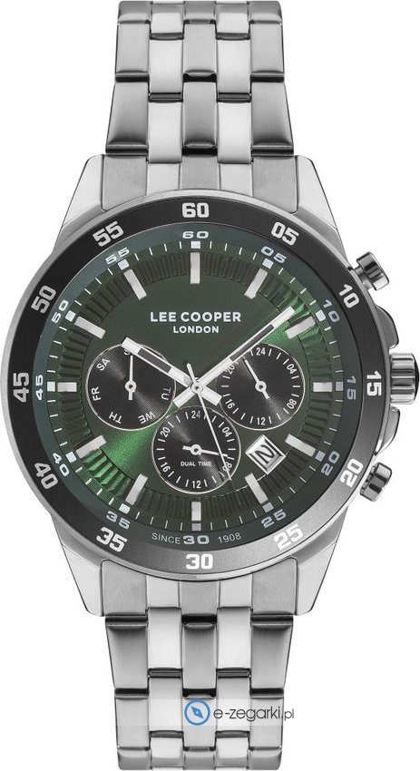 Model LC07330.370 marki Lee Cooper to elegancki zegarek naręczny męski, który posiada ciekawe rozwiązania i funkcje. Charakteru nadaje wysokiej jakości tarcza w kolorze zielonym. Zaprezentowana metodą analogową bieżąca godzina jest czytelna i prosta do odczytania. Koperta jest w kolorze stalowym - w kształcie okrągłym.