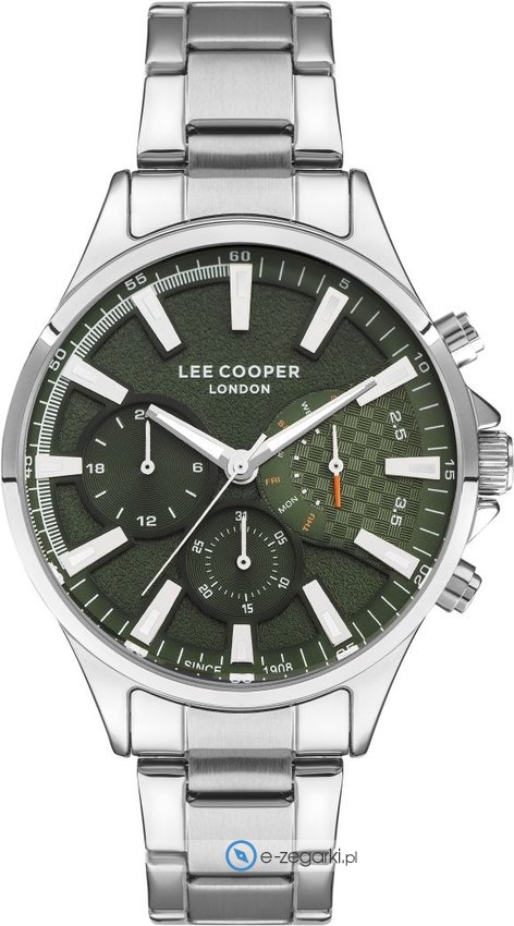 Zegarek męski LC07394.370 marki Lee Cooper to dobre połączenie funkcjonalności a także ciekawego wzornictwa. Charakterystyczną budowę czasomierza uzyskano dzięki tarczy w kolorze zielonym. Godzina prezentowana jest w sposób analogowy co bez trudu pozwala ją odczytać. Koperta w barwach koloru srebrnego szeroka jest na 44 mm - posiada okrągły kształt.