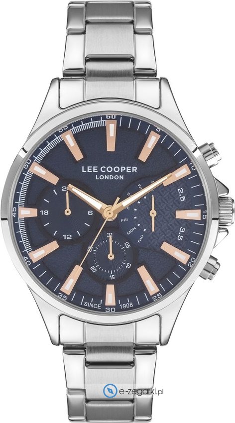 Zegarek męski LC07394.390 marki Lee Cooper to stylowe połączenie funkcjonalności a także ciekawego wzornictwa. Stylu dodaje wysokiej klasy cyferblat w kolorze granatowym. Zegarek ten pokazuje aktualny czas w formacie analogowym dzięki temu odczyt jest bardzo łatwy. Koperta jest w kolorze srebrnym szeroka jest na 44 mm - w kształcie okrągłym.